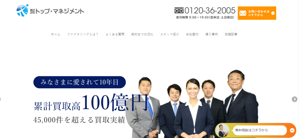 | トップ・マネジメント | 2社間・3社間 | 2%〜 | 最短即日 | 〜数億円 | 対応 | 大口対応/法人向け |