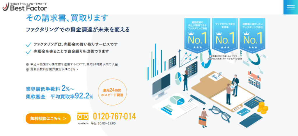 審査の柔軟さと手数料の安さ、そしてスピード感を兼ね備えたファクタリング会社として、資金繰りに悩む多くの事業者から信頼を集めています。